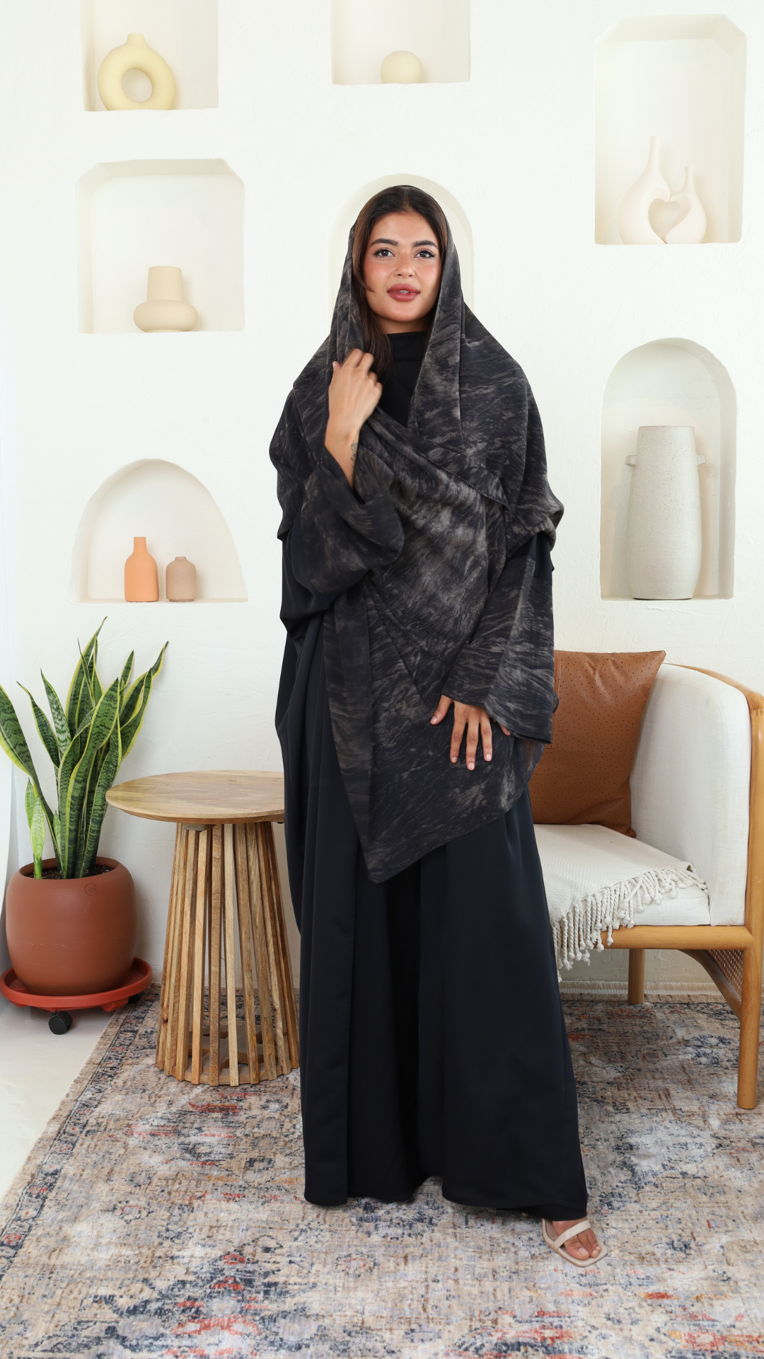 عباية ربع بشت بقماش صيفي وبارد جداً مع تدخيلات كم وطرحة مشجر شيفون